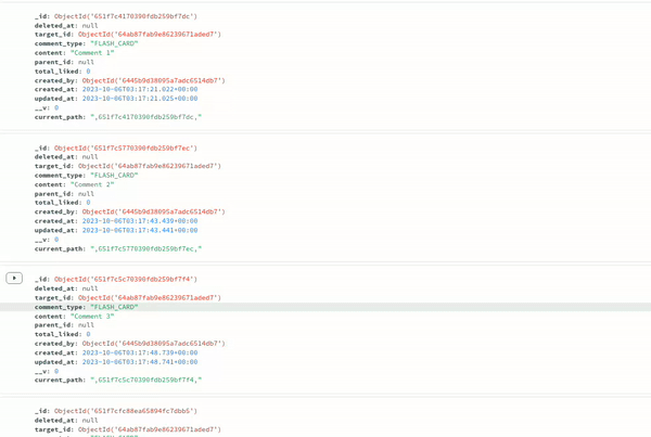 Có thể các bạn sẽ để ý mặc dù chúng ta đã trả về toàn bộ reply comments nhưng chúng không được sắp xếp theo cấu trúc đúng với độ sâu. Vấn đề này thì tùy theo cách làm việc của mỗi team, mình thường sẽ nhờ FE control việc đó để tránh BE phải đảm nhận quá nhiều việc.