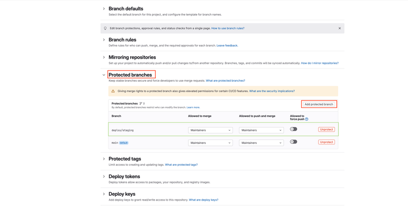 , với option đó thì các bạn cần làm thêm một bước là truy cập vào Setting=>Repository=>Projected branches. Nếu chưa có thì các bạn tiến hành bấm nút Add protected branch