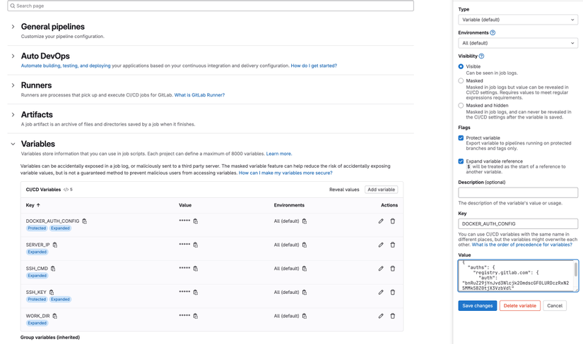 vào CICD Variables. Các bạn vào CICD Variables như trước đó đã làm vào tạo thêm biến DOCKER_AUTH_CONFIG, thêm giá trị bên dưới vào:{ "auths": { "registry.gitlab.com": { "auth": "bXlfc2VydmljZV91c2VybmFtZTpteS1naXRsYWItdG9rZW4=" } } }