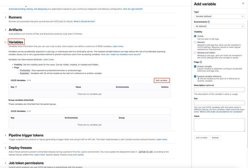 Sau đó chọn expand mục Variables và bấm vào Add variable