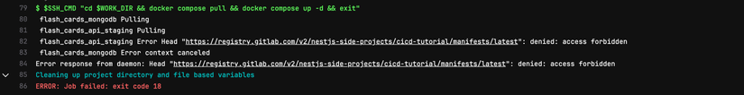 - $SSH_CMD “docker login registry.gitlab.com -u $CI_REGISTRY_USER -p $CI_JOB_TOKEN && cd $WORK_DIR && docker compose pull && docker compose up -d && exit” ```