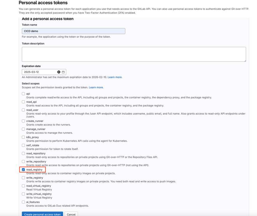 để biểu thị rằng token này có thể pull private image từ gitlab registry. Bấm nút Create personal access token vào copy lại token.