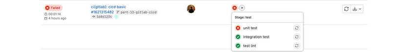 Lúc này thì chúng ta sẽ bấm vào job để có thể xem được vấn đề đang gặp là gì sau đó có thể thông báo cho team member❗️ (vì đôi lúc job có thể failed do vấn đề từ các runner chạy job của Gitlab, lát nữa chúng ta sẽ đề cập đến vấn đề đó). Hình bên dưới cho chúng ta thấy lỗi ở bước chạy unit test ở file **modules/users/users.service.spec.ts**