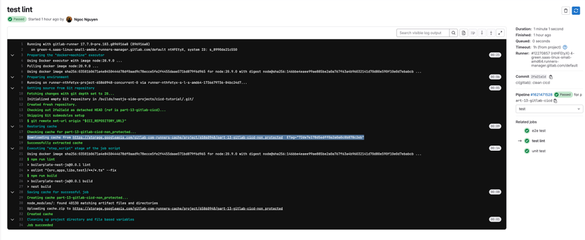 - Các mục như `test lint`, `unit test`, `integration test`,... được gọi là các **Job**, là các công việc chúng ta mong muốn thực hiện.